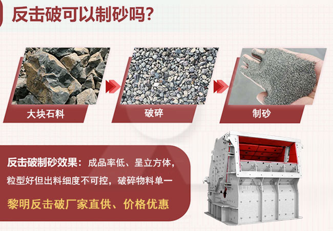 反擊破是可以製砂的,但是根據目前的生產(chan) 實驗得到的數據,基本可以達到製砂的效果,反擊破的製砂率大概在30%左右。畢竟不是專(zhuan) 業(ye) 製砂設備,如果對機製砂成品要求比較高的話,建議後續還是再加一台專(zhuan) 業(ye) 製砂設備。